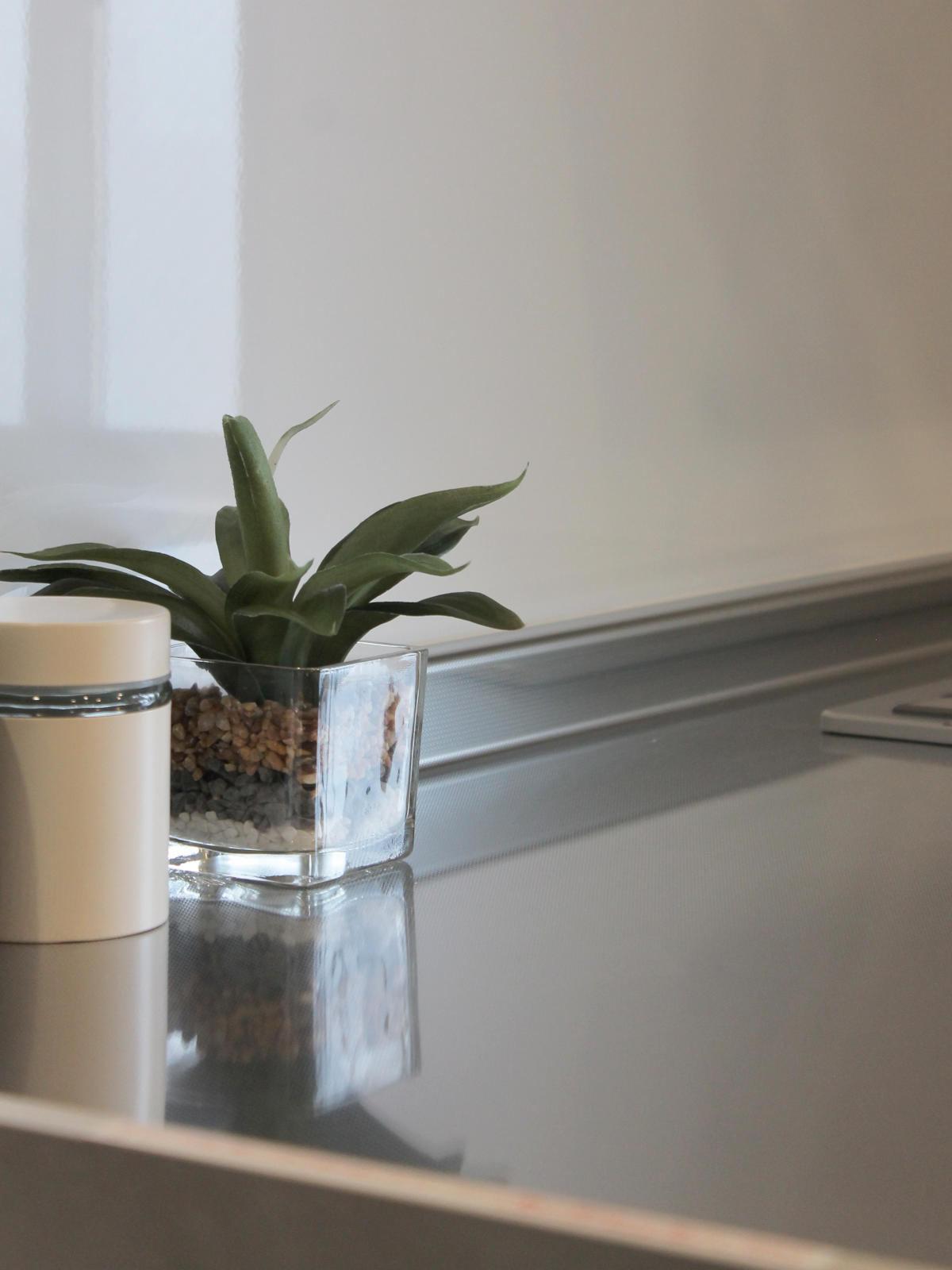 インテリアは、木目の温かみとグレーのシャープさをバランスよく掛け合わせたコーディネート。キッチン全体が落ち着いたトーンにまとまり、コンパクトながらも上質な雰囲気が漂います。