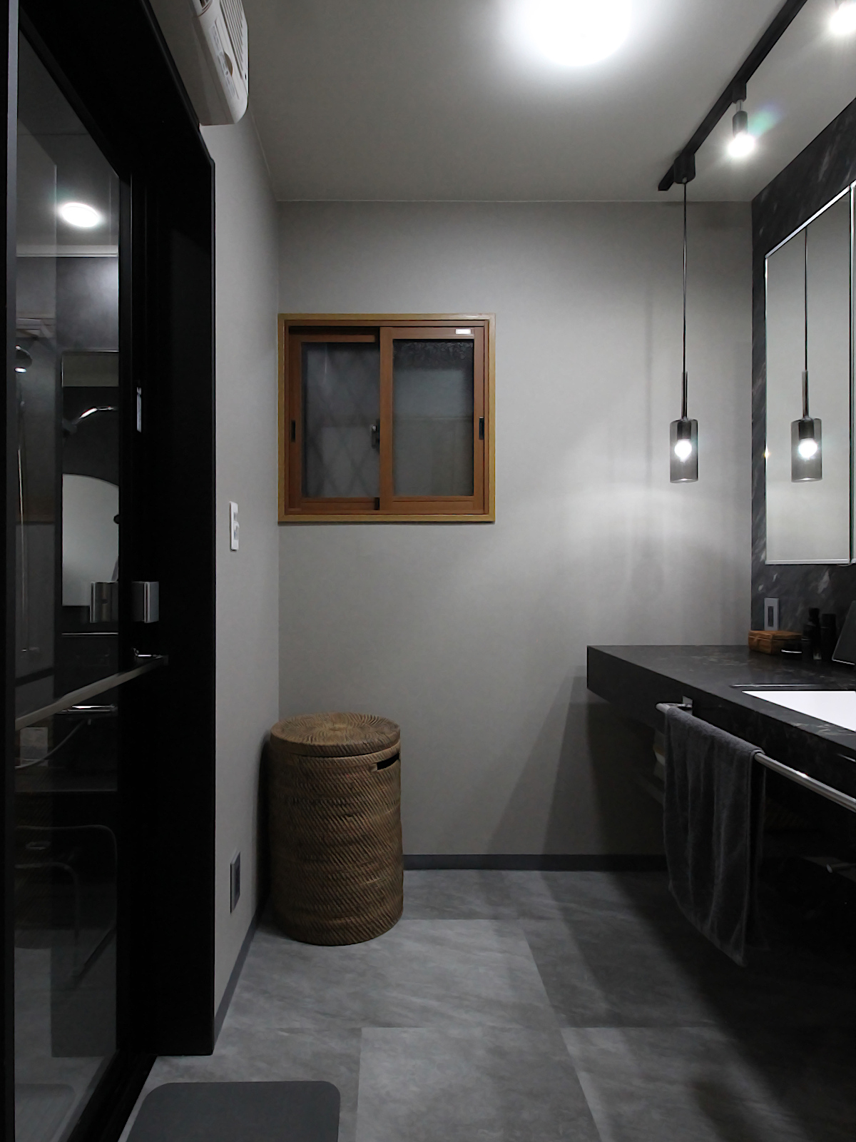 洗面リノベーション事例。グレートーンの内装とペンダントライトの組み合わせで上質な陰影を演出。サンゲツ【RE-53189】採用。