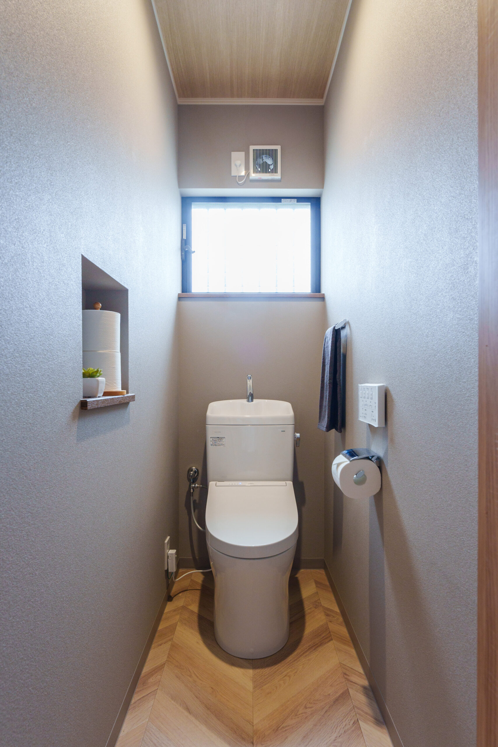 グレージュの壁紙とヘリンボーンで仕上げたトイレ空間。