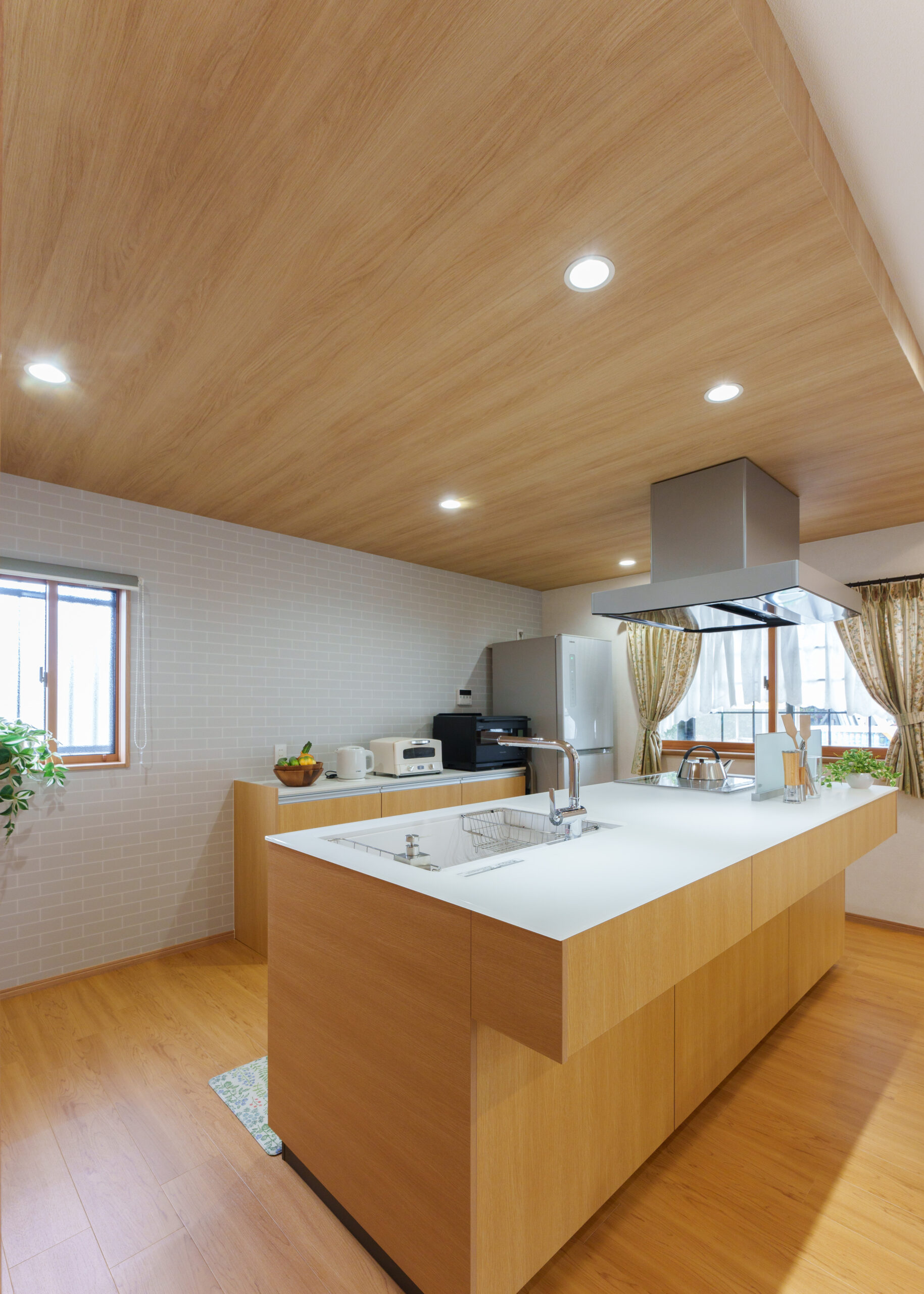 かつては壁付けで、リビングの隅に取り残された印象だったキッチン。H様は「もっと明るく、家族と向き合える場所に」との想いから、中央に据えたアイランド型へとリフォーム。天井高までのパントリー収納も設計し、細々した調理器具や日用品がすっきりと収まるように。木目の下がり天井で変化をつけた特別な空間に。