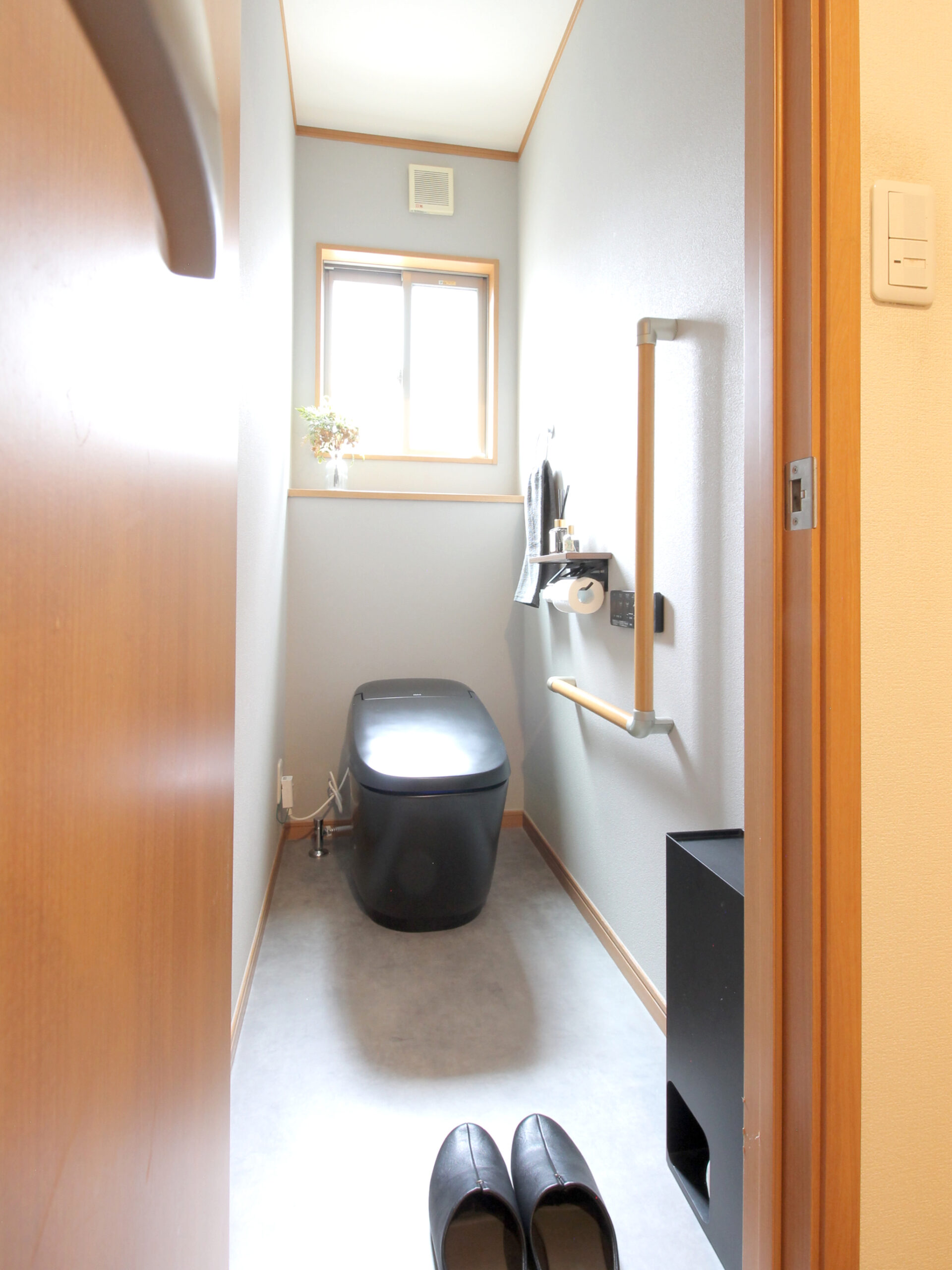 毎日の掃除が少しでも楽になるよう、機能面を重視しながら計画しました。黒い便器は存在感がありますが、周囲の色を抑えることで圧迫感が出ないよう配慮しています。清潔さと落ち着きが自然に続く、長く使いやすいトイレ空間を目指しました。