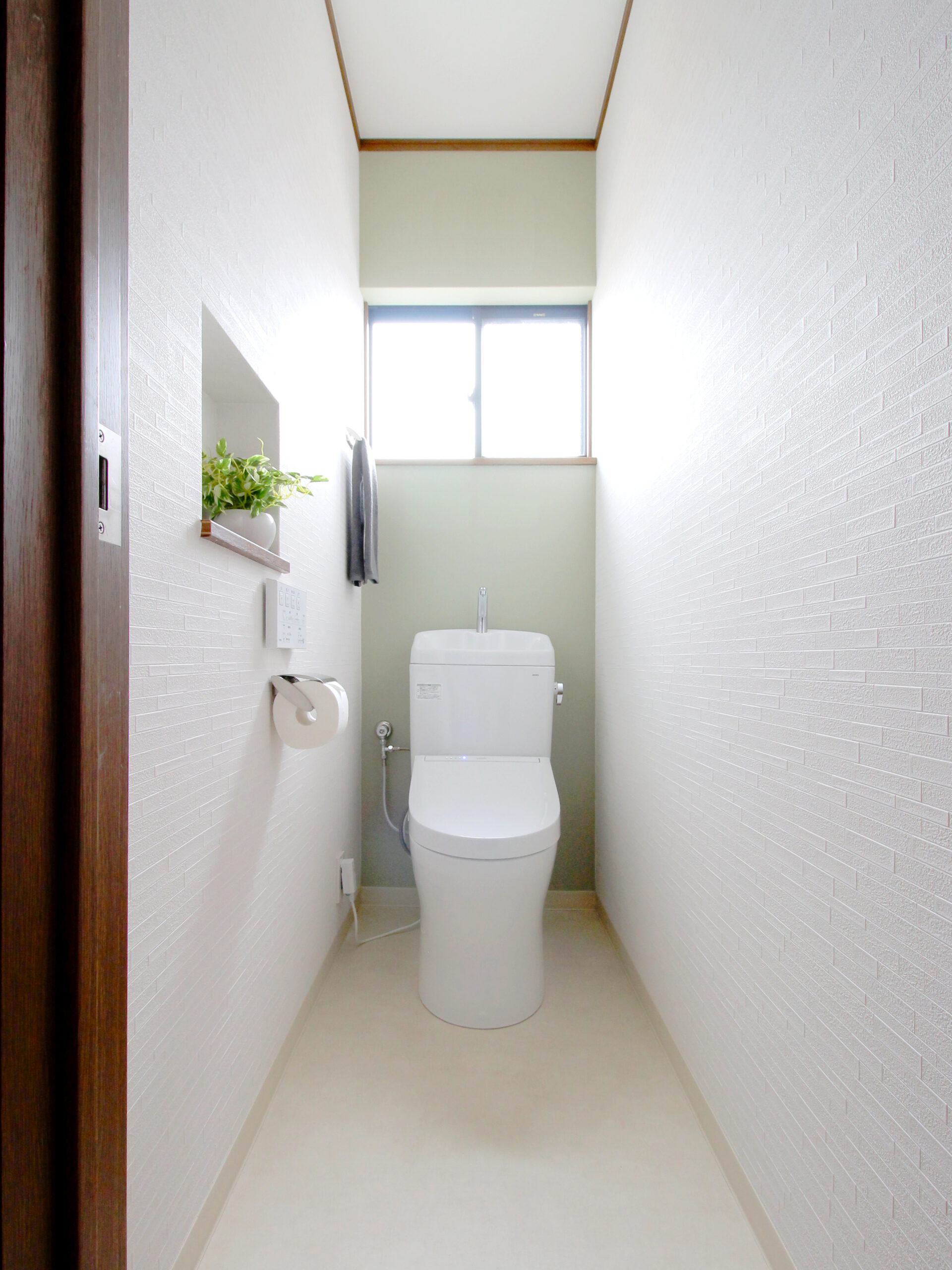 寝室に近いトイレということもあり、目に入る色や質感がやさしく感じられるよう意識しました。グリーンは主張しすぎない淡いトーンを選び、白いレンガ調クロスと組み合わせることで、明るさと落ち着きを両立しています。短い時間でも気持ちが整う、そんな空間になるよう細部まで整えました。